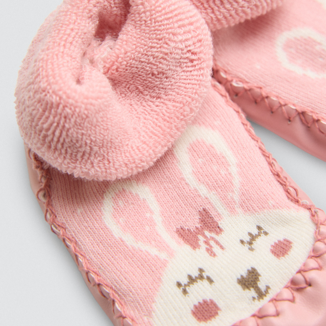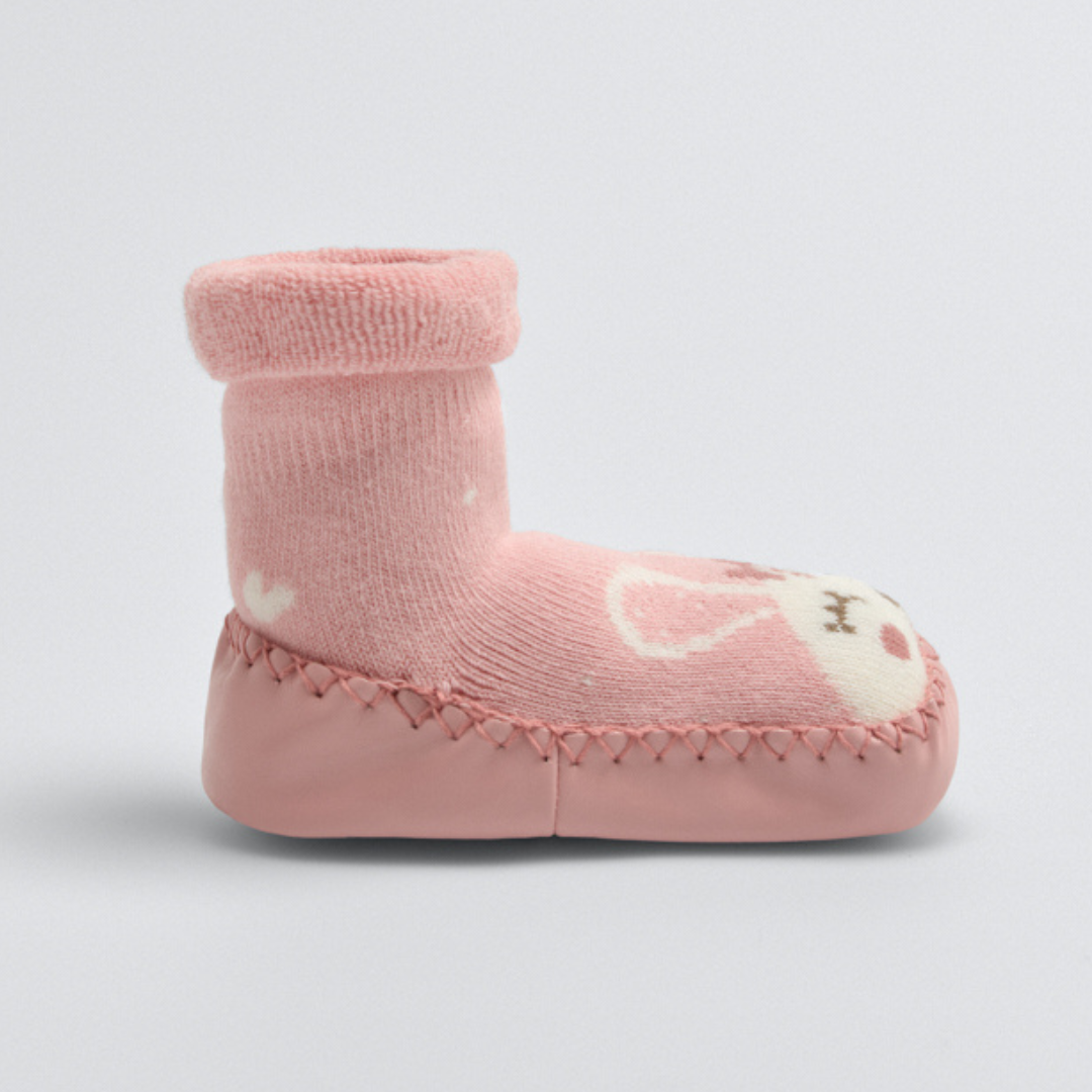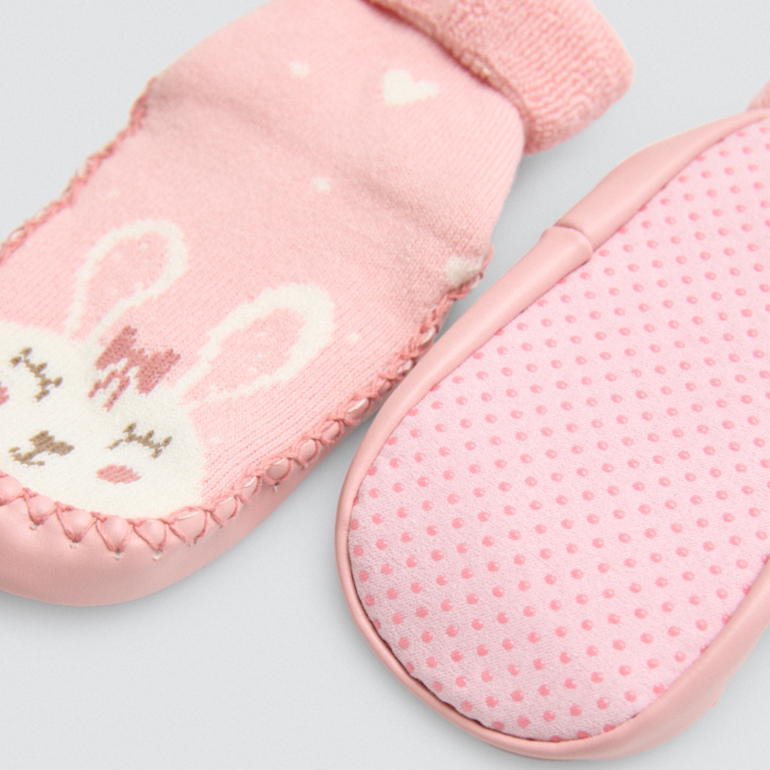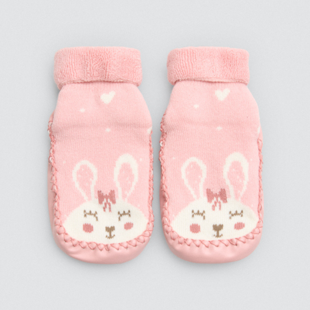 Calcetines zapatilla térmicos con estampado de conejito para bebé con suela antideslizante y puño antipresión.