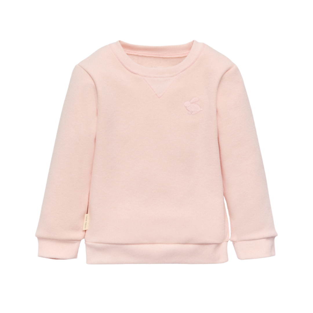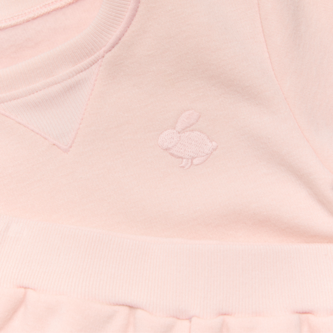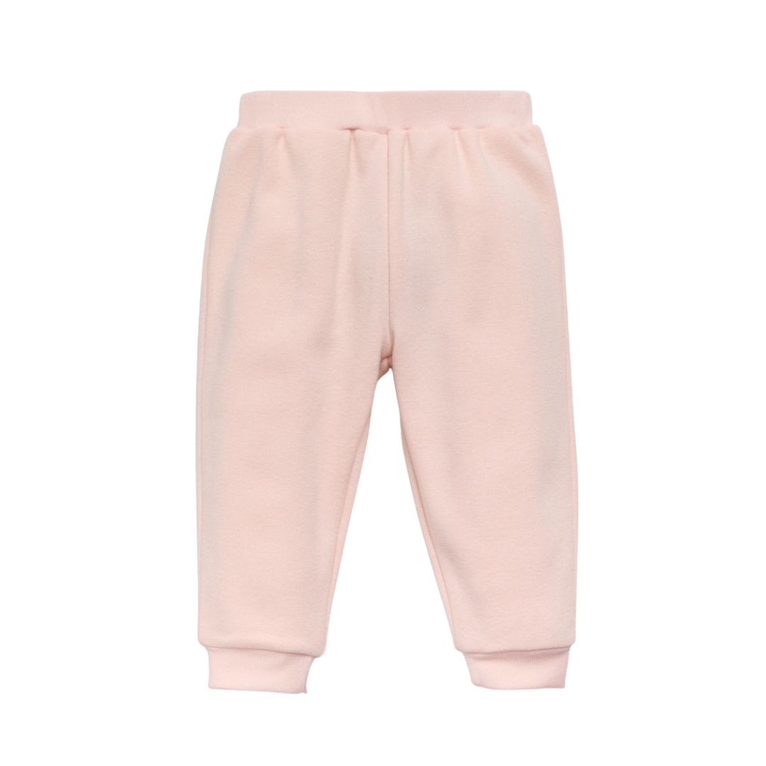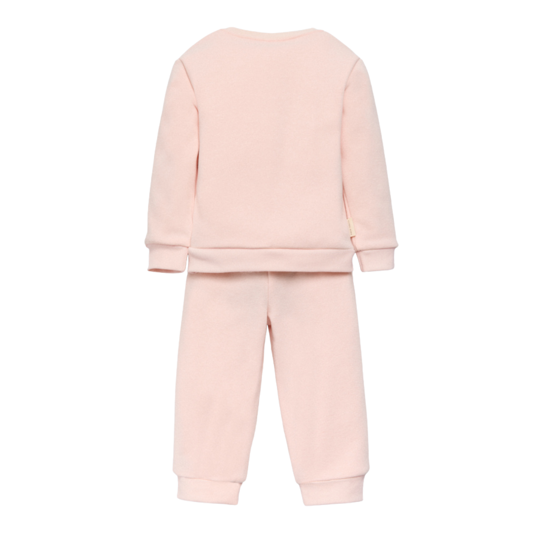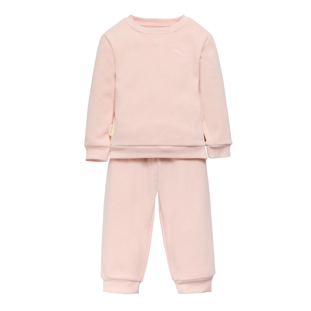 Conjunto básico deportivo ideal para el día a día en color rosa. Compuesto por una sudadera de manga larga con cuello redondo, puños acanalados y detalle bordado de conejito en el pecho y un pantalón con cintura con goma para un ajuste cómodo. Su interior es afelpado y su diseño ofrece suavidad y libertad de movimiento.