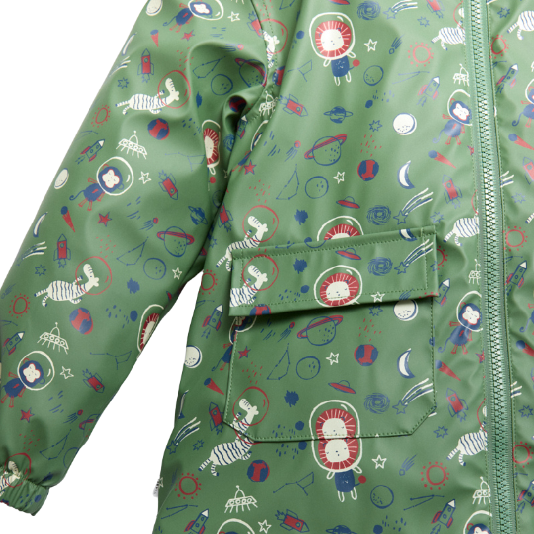 Chubasquero infantil con estampado galáctico, forro polar interior, gorro, cremallera central, bolsillos delanteros y puños elásticos.