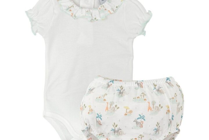 Conjunto de baño, marca Ysabel Mora primavera – verano 2026, compuesto por camiseta sin mangas con dibujo de arcoíris en relieve, detalles de volantes en el bajo de la camiseta y lazos de algodón con estampado de unicornios a juego con la braguita.