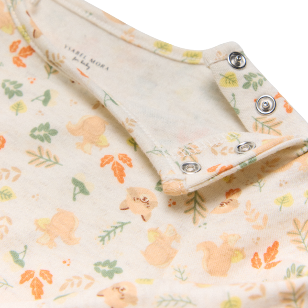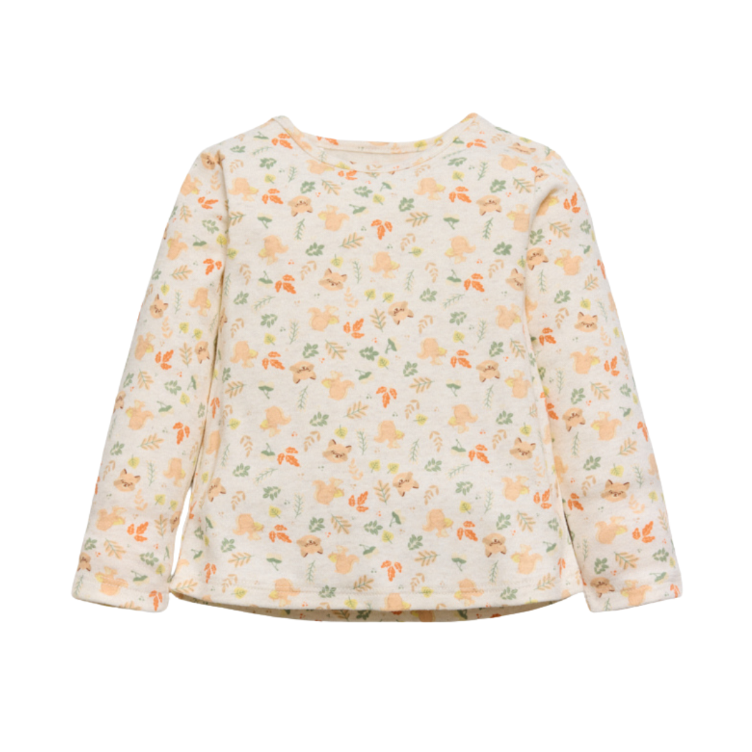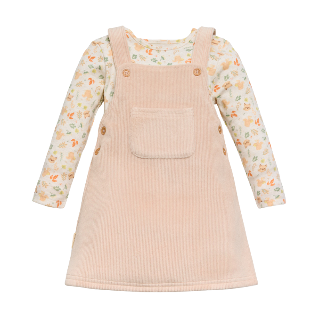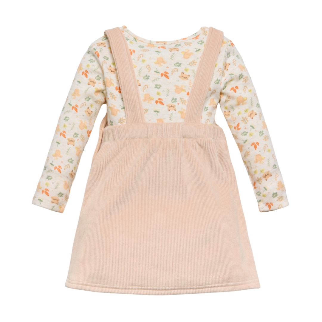 Conjunto de dos piezas formado por una camiseta de manga larga estampada y vestido peto con interior afelpado y diseño cálido y cómodo.