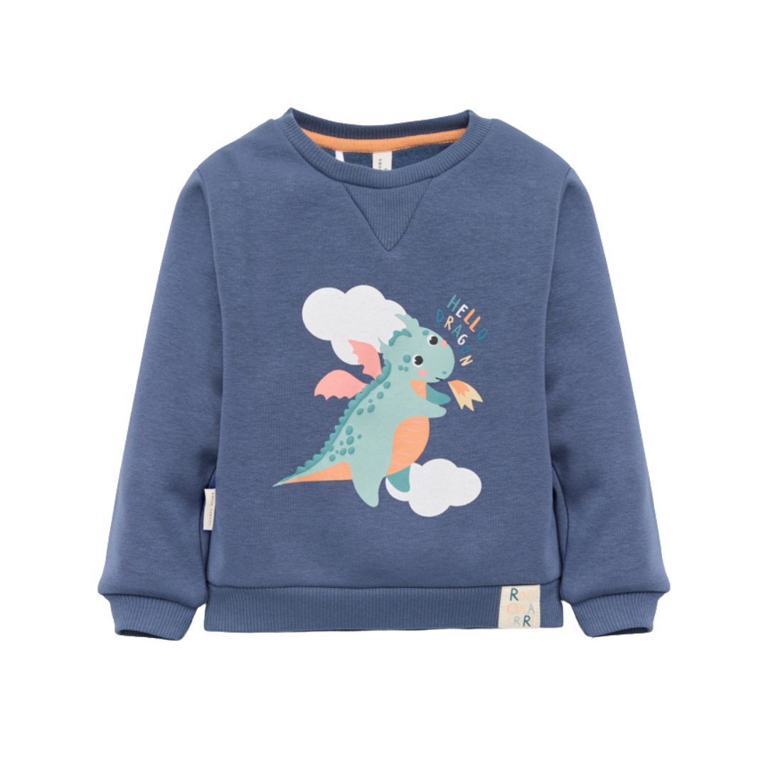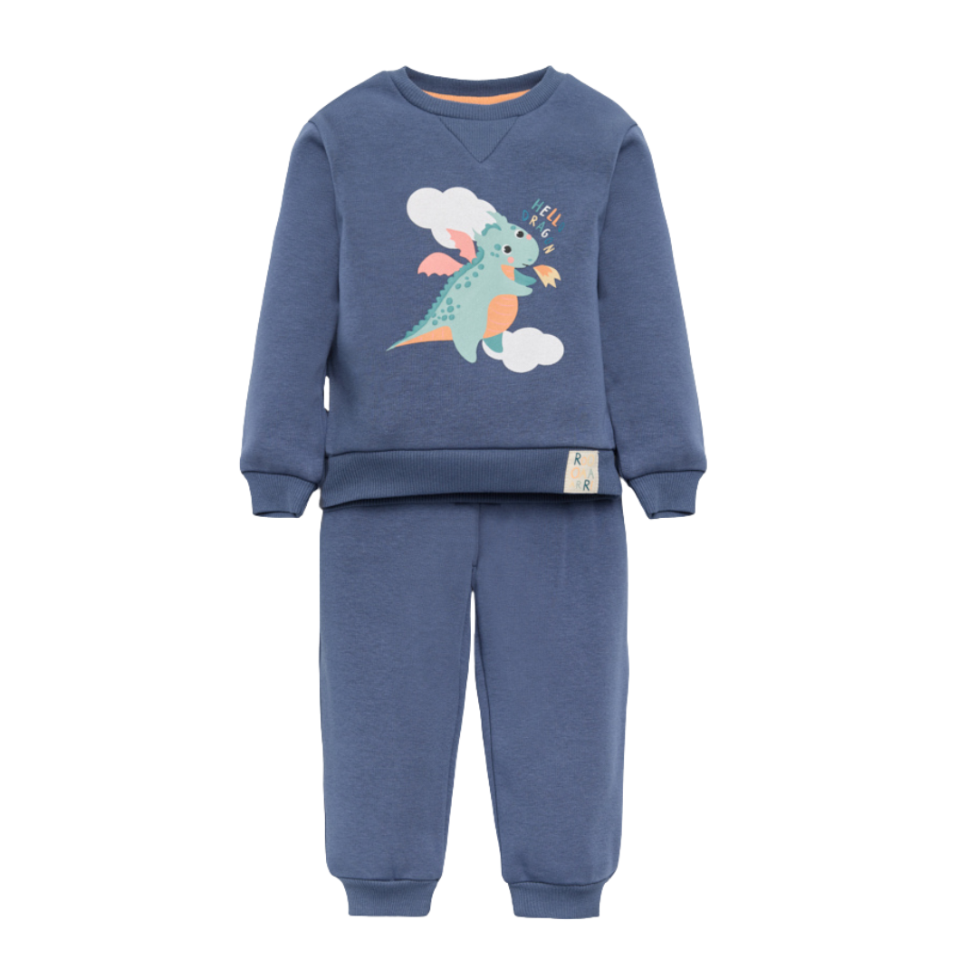Conjunto compuesto por sudadera con estampado de dragón y pantalón con cinturilla elástica ajustable. Conjunto con interior afelpado y tejido suave para mantener el calor perfecto para pequeños aventureros en días frescos.