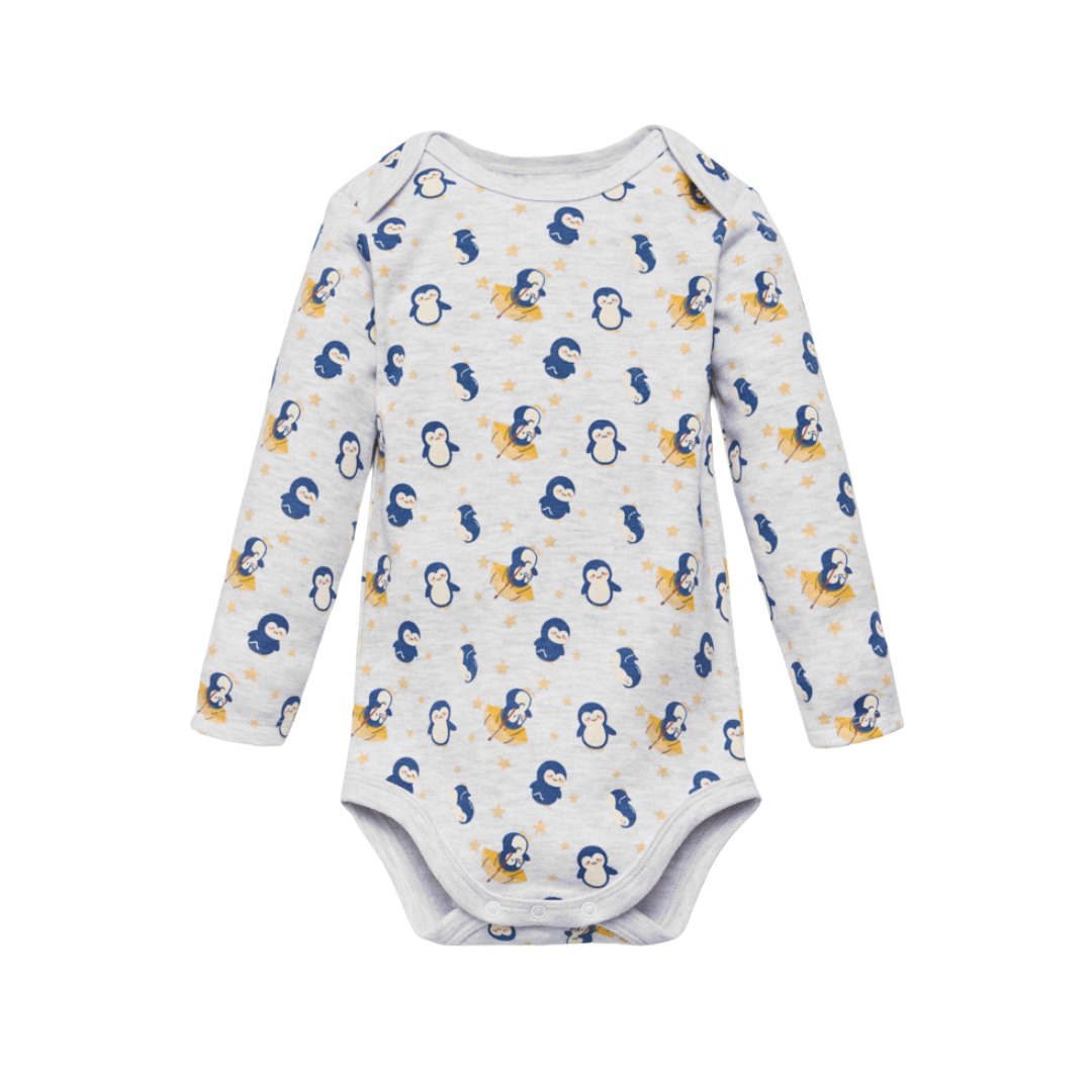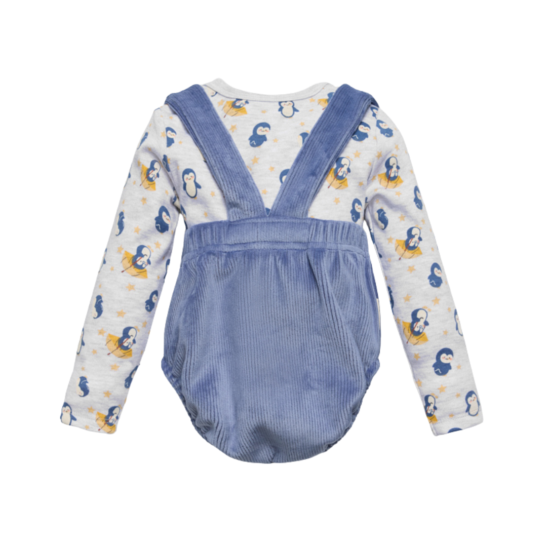 Conjunto con interior afelpado formado por body  de manga larga con estampado de pingüinos y un peto corto con cierre de botones.