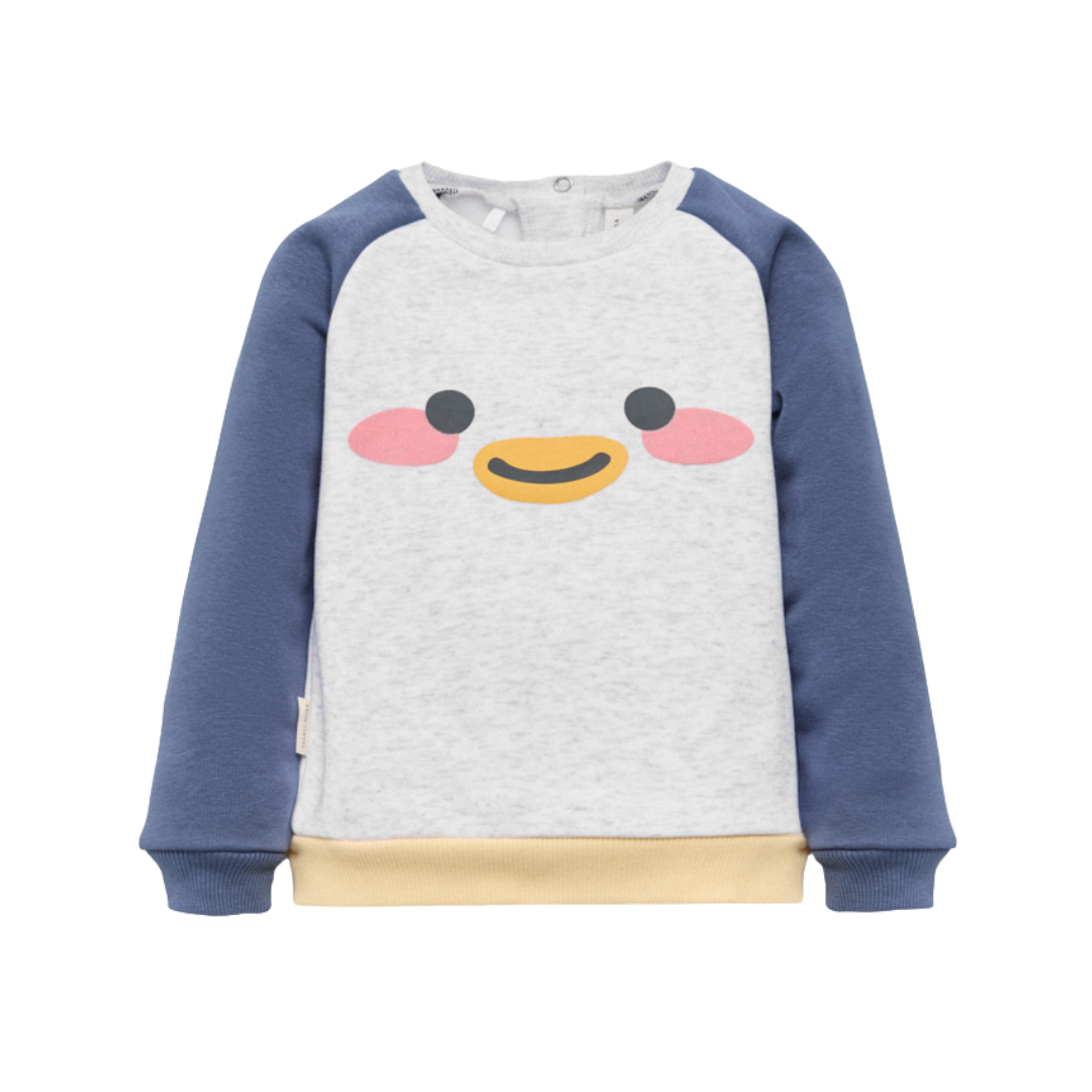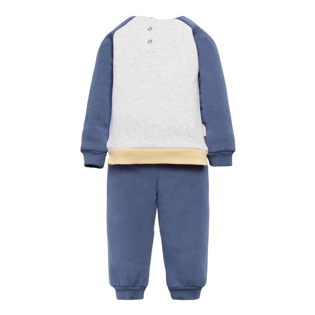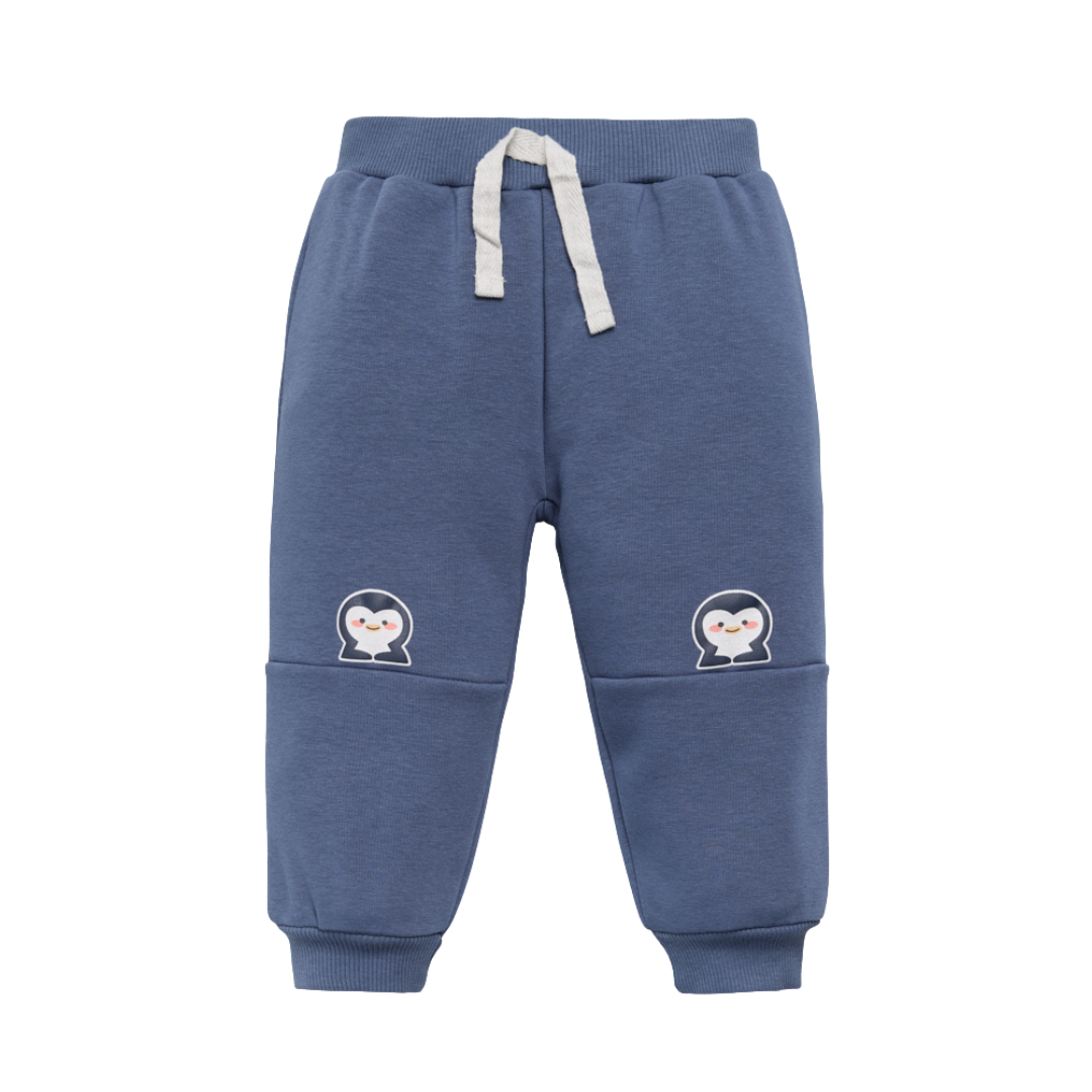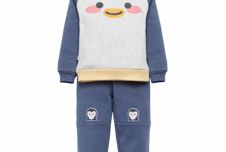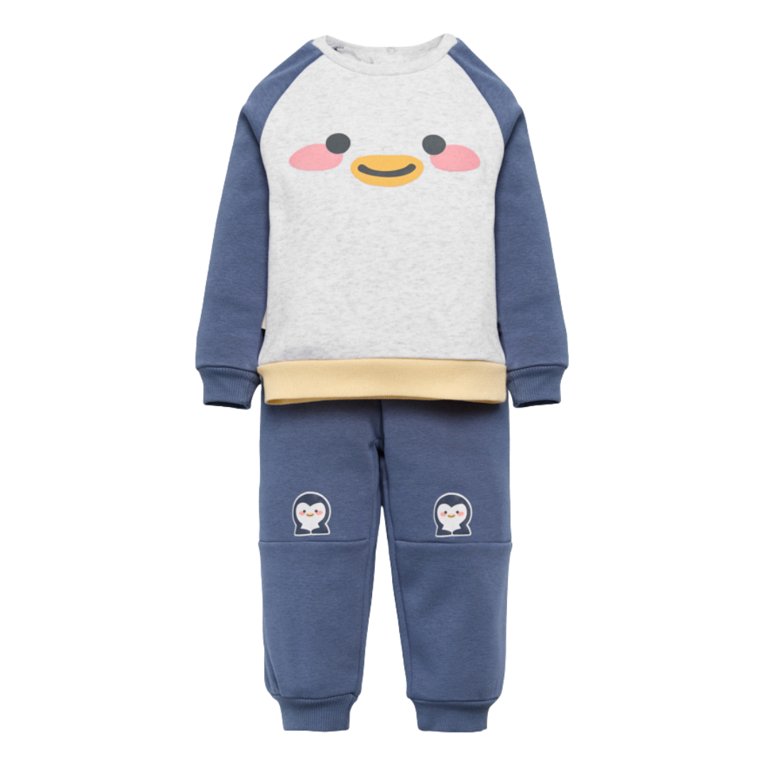 Conjunto compuesto por sudadera con estampado de pingüino y pantalón con cintura ajustable y rodilleras decorativas de pingüinos. Su interior es afelpado suave y cómodo perfecto para jugar o pasear con estilo en invierno.