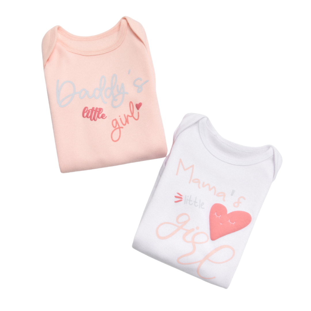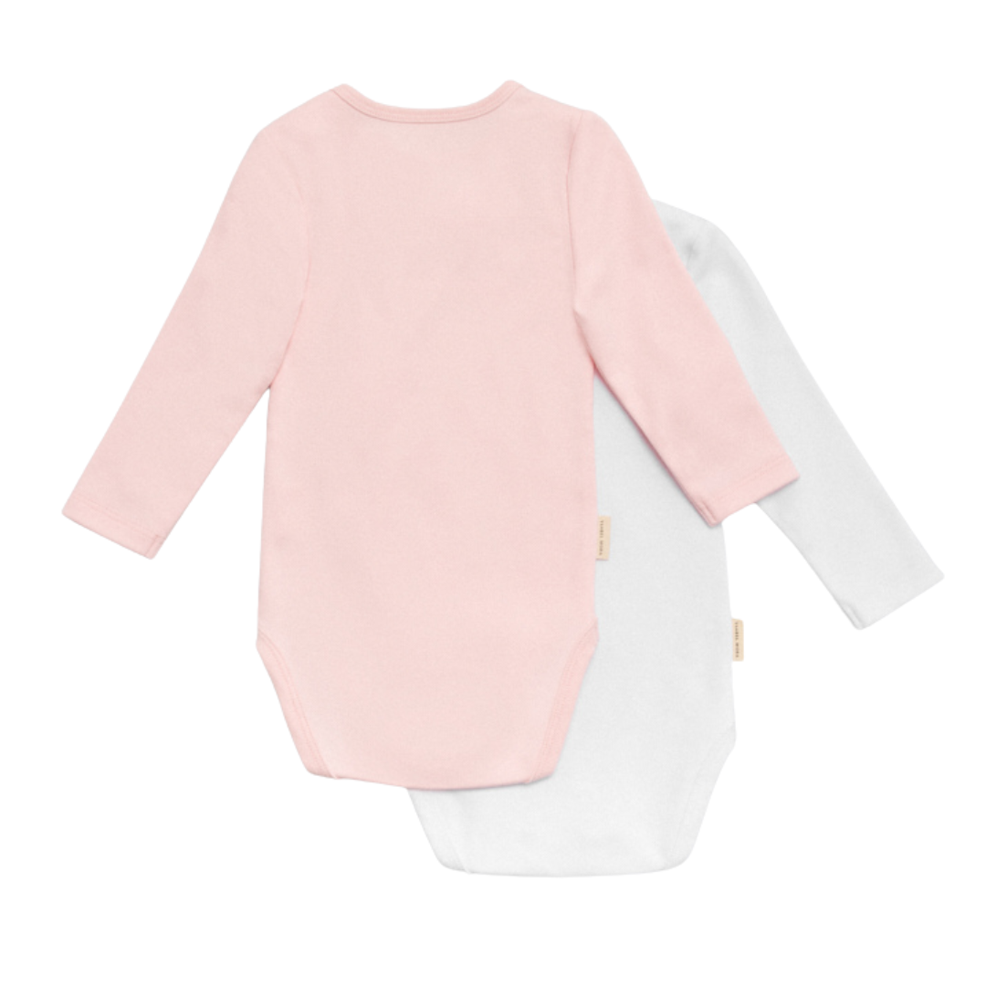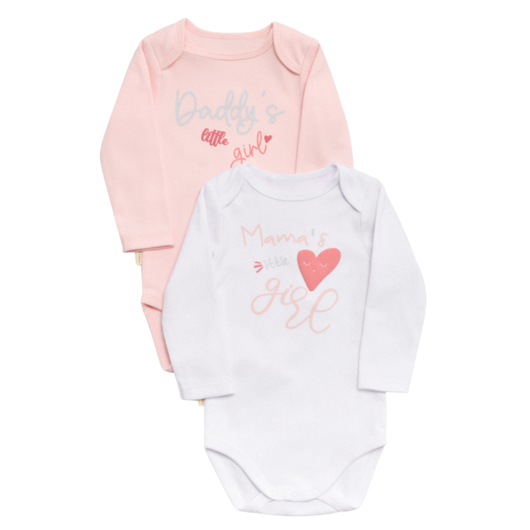 Set de dos body de manga larga para bebé niña con estampados dulces y tiernos. Confeccionados en algodón natural con interior afelpado. Suaves, cómodos y perfectos para uso diario o regalar.