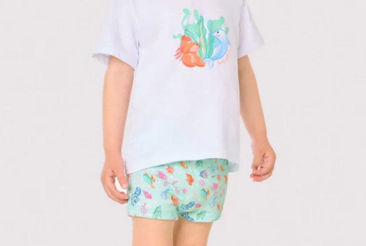 Pelele confeccionado en 100% algodón con estampado marino de peces, coral y pequeñas estrellas. Destaca el volante en tejido vichy rosa, los botones en la parte delantera que permite ajustar la prenda así como el cierre inferior con botones a presión y las perneras con goma elástica suave.