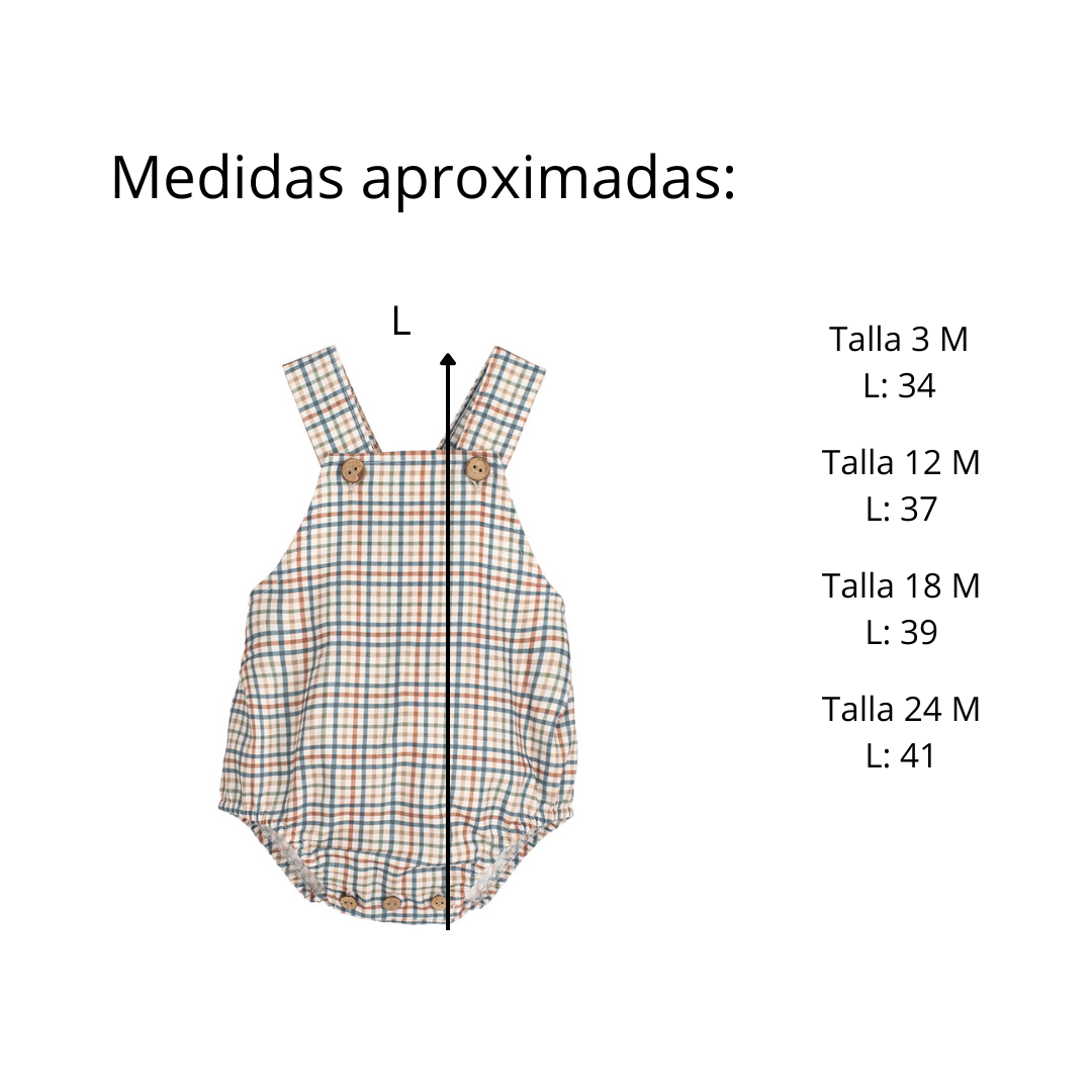 Peto en color arena con estampado de cuadros, botones de madera en tirantes, cierre inferior y goma en piernas para un ajuste cómodo y seguro.