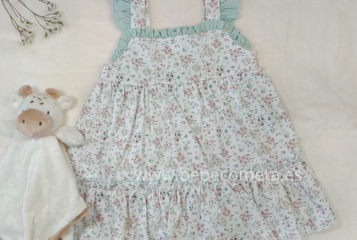 Vestido de tirantes con estampado floral y volantes en tono verde claro 100% algodón.